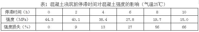 (6)在初凝時(shí)間內(nèi)的混凝土,由于氣溫較高、運(yùn)距較遠(yuǎn)、壓車時(shí)間較長等造成混凝土坍落度損失較大,可通過試驗(yàn)添加同型號(hào)的泵送劑或減水劑,但添加與原先已加的總和摻量不能超過外加劑最大摻量的20%。應(yīng)逐漸添加,先少加,摻入后,攪拌運(yùn)輸車必須快速轉(zhuǎn)動(dòng)2min左右,測定坍落度符合要求。運(yùn)到現(xiàn)場的混凝土不能立即卸料,應(yīng)快速轉(zhuǎn)動(dòng)運(yùn)輸車2min后卸料,以確保坍落度和質(zhì)量。對超過初凝時(shí)間的混凝土應(yīng)廢棄,不能再使用?;炷翝仓巴臅r(shí)間越長,混凝土強(qiáng)度損失越嚴(yán)重(如表1),應(yīng)當(dāng)引起足夠重視。