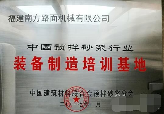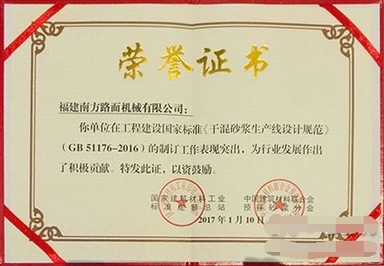 2017年1月10日,在2017'首屆中國國際預拌砂漿裝備技術研討會暨預拌砂漿綠色生產(chǎn)裝備及機械化施工技術峰會上,福建南方路面機械有限公司被中國建材聯(lián)合會預拌砂漿分會授予“中國預拌砂漿行業(yè)裝備制造培訓基地”;同時,因在國家標準GB51176-2016《干混砂漿生產(chǎn)線設計規(guī)范》編制工作中的特殊貢獻,被授予“特別貢獻單位”。