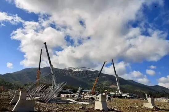此項(xiàng)工程分兩期建設(shè),一期兩條生產(chǎn)線已進(jìn)入收尾階段,二期八條生產(chǎn)線,正在施工建設(shè)。此次吊裝的網(wǎng)架主體總重15噸,高度20米,需要4臺設(shè)備聯(lián)合操作,這無疑是一場對起重機(jī)性能的考驗(yàn),施工方選擇了徐工QY25K5-I來完成這項(xiàng)任務(wù)。