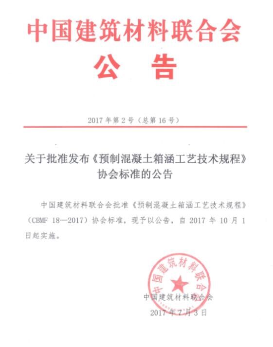 摘要:2017年7月,由中國混凝土與水泥制品協(xié)會(以下簡稱協(xié)會)組織制定的《預制混凝土箱涵工藝技術規(guī)程》和《混凝土用氧化鎂膨脹劑》兩項協(xié)會標準,通過審定并發(fā)布批準公告,標準號分別為CBMF 18-2017和CBMF 19-2017,將同時于2017年10月1日起實施。