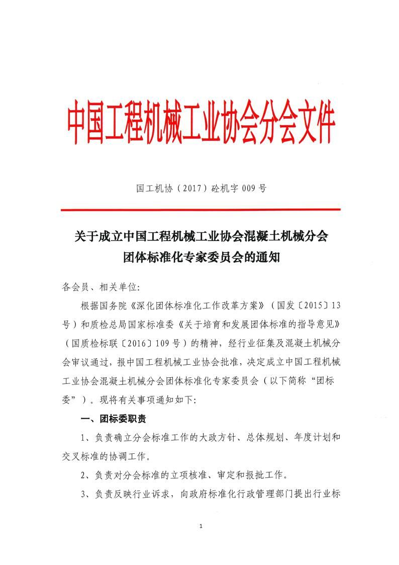 《關(guān)于成立中國工程機械工業(yè)協(xié)會混凝土機械分會團體標(biāo)準(zhǔn)化專家委員會的通知》