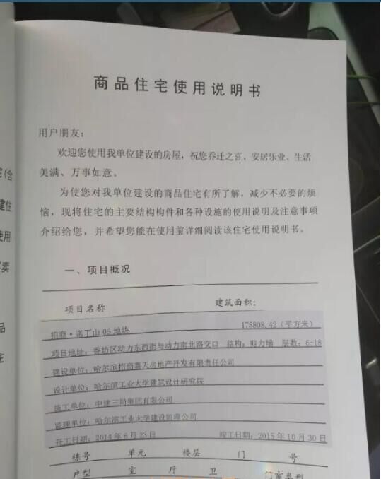 在哈爾濱市城鄉(xiāng)建設(shè)委員會官方網(wǎng)站上,記者查到了“招商諾丁山 05 地塊 8#樓”的《哈爾濱市工程竣工驗收備案證》,備案號為黑建備字號2015380,建設(shè)單位為哈爾濱招商嘉天房地產(chǎn)開發(fā)有限責任公司,施工單位為中建三局集團有限公司,監(jiān)理單位為哈爾濱工業(yè)大學建設(shè)項目管理公司,開竣工日期為2014年6月15日-2015年12月18日,備案日期2015年12月18日。