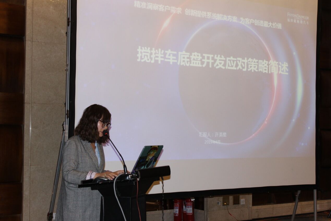 北汽福田汽車股份有限公司技術(shù)部部長許美星女士作了《適應(yīng)攪拌車新法規(guī)之底盤設(shè)計(jì)》的主題報(bào)告,結(jié)合攪拌車的發(fā)展趨勢介紹了重卡發(fā)展的總體趨勢以及政策法規(guī)制定進(jìn)程,有很多參考的價(jià)值和意義。同時(shí)許部長還介紹了認(rèn)證體系中的主要應(yīng)對(duì)項(xiàng)以及BFDA產(chǎn)品開發(fā)應(yīng)對(duì)策略,讓與會(huì)者對(duì)于配套的底盤及政策有了更多了解。