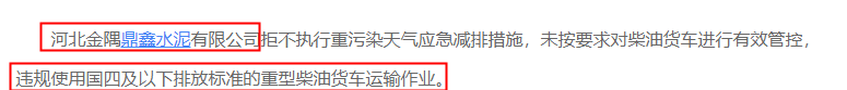 此外,今年10月河北金隅鼎鑫水泥有限公司拒不執(zhí)行重污染天氣應(yīng)急減排措施,未按要求對(duì)柴油貨車進(jìn)行有效管控,違規(guī)使用國(guó)四及以下排放標(biāo)準(zhǔn)的重型柴油貨車運(yùn)輸作業(yè),被當(dāng)?shù)丨h(huán)保部門通報(bào)。