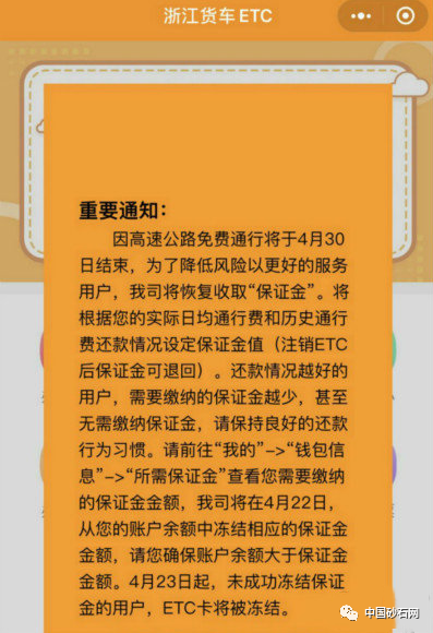 同日,浙江貨車ETC首頁發(fā)布通知,表示高速公路免費(fèi)通行將于4月30日結(jié)束。