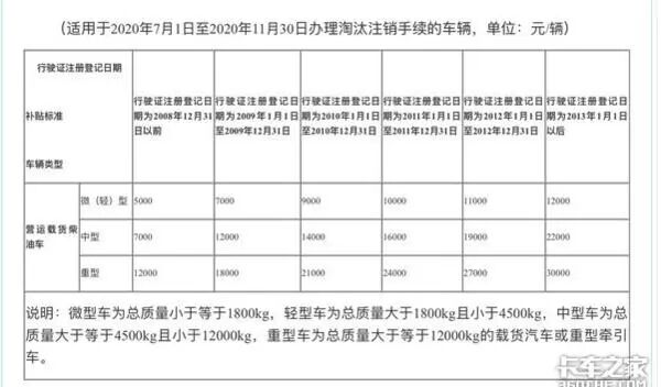 浙江省麗水市的國(guó)三淘汰補(bǔ)貼分為兩個(gè)階段,以7月1日為分界線,2020年6月30日之前淘汰國(guó)三柴油貨車最高可拿到3.7萬(wàn)元補(bǔ)貼;7月1日至11月30日,最高可享受補(bǔ)貼3萬(wàn)元。