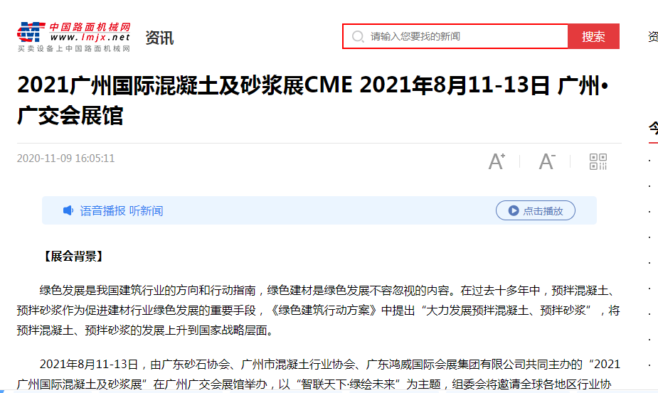 廣州國際混凝土及砂漿展已于2020年成功舉辦,自項目立項以來,得到多方媒體的關注和報道。據(jù)統(tǒng)計,2020-2021年度,騰訊視頻、愛奇藝、土豆網(wǎng)、優(yōu)酷視頻等電視媒體,網(wǎng)易房產(chǎn)、新浪家居、廣州搜狐焦點、騰訊網(wǎng)、中國數(shù)字經(jīng)濟網(wǎng)、央廣網(wǎng)、360慧聰網(wǎng)、南方網(wǎng)、北方網(wǎng)、羊城晚報、廣州日報、新浪網(wǎng)、新京報、21世紀經(jīng)濟報道、東方網(wǎng)、光明網(wǎng)、中國商業(yè)新聞網(wǎng)、焦點中國網(wǎng)等主流媒體,抖音、快手、西瓜視頻、今日頭條、百家號、火山小視頻等視頻媒體和廣東建設報、中國路面機械網(wǎng)、新型砂漿網(wǎng)、世界機械網(wǎng)、工程機械在線、攪拌設備網(wǎng)、中國保溫砂漿網(wǎng)等行業(yè)媒體,以及《混凝土雜志》、《砼時代》等雜志媒體均對展會給予高度關注,積極宣傳展會動態(tài)與資訊。感謝各行業(yè)媒體、主流媒體、視頻媒體、雜志的大力支持與高度認可。