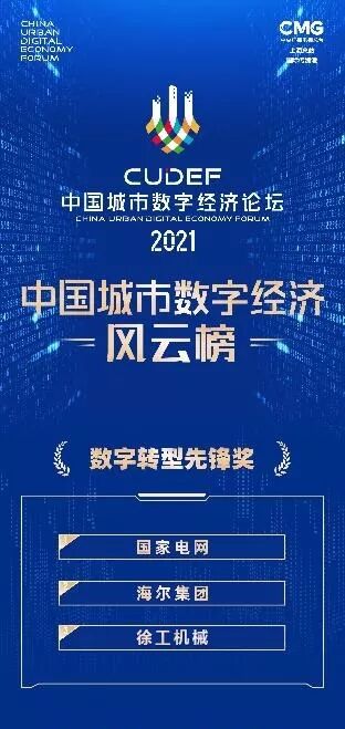 論壇上,《中國城市數(shù)字經濟風云榜》榮耀發(fā)布。榜單包括“城市數(shù)字經濟競爭力綜合排名”,同時多項重磅獎項發(fā)布,“數(shù)字賦能先鋒獎”“數(shù)字轉型先鋒獎”“數(shù)字應用方案獎”。徐工機械與國家電網(wǎng)、海爾集團同時榮獲“數(shù)字轉型先鋒獎”,成為唯一入選的工程機械制造企業(yè)。