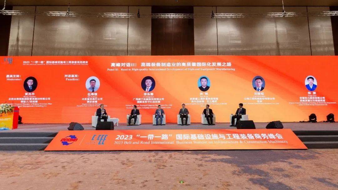 第二場高峰對話由北京出海領航國際管理顧問有限公司創(chuàng)始人、總經理黃兆華主持,邀請中聯重科、廣西柳工、山推、鐵建重工、安徽合力公司高管,圍繞“高端裝備制造業(yè)的高質量國際化發(fā)展之路”展開對話交流,對話嘉賓聚焦后疫情時代國際基礎設施發(fā)展的機遇,分享工程裝備制造業(yè)高質量發(fā)展的經驗和建議。