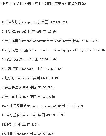 分析指出,受大宗商品價格下跌、新型經(jīng)濟體經(jīng)濟增速減緩和世界經(jīng)濟不景氣的影響,全球前50家工程機械制造企業(yè)總產(chǎn)值較上一年度下跌16.2%,達到1330億美元,創(chuàng)2009年以來新低。據(jù)中國工程機械商貿(mào)網(wǎng)編輯了解,2009年,工程機械行業(yè)一年銷售額下降了1090億美元。自那時起,工程機械行業(yè)收入下降趨勢一直未有改變。報告同時強調(diào),榜單上下滑最為嚴(yán)重的是中國企業(yè),這很大程度上是因為中國經(jīng)濟增速的放緩。中國企業(yè)中,只有徐工集團仍然保持在前十強,位列榜單第九位?!斑@個市場趨勢表現(xiàn)最顯著的就是中國建筑設(shè)備制造商,相比去年,所有中國企業(yè)的排名有所下滑。排名前十的企業(yè)中,如今只有徐工一家中國工程機械制造廠商?!?/span>