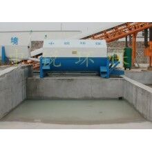 該系統(tǒng)主要由:攪拌車加水清洗裝置,溜槽輸送裝置,砂石漿水分離裝置,和泥漿水后處理裝置組成?;炷凛斔驮O(shè)備清洗后,將殘余混凝土排入溜槽中,在高壓水流沖擊下,經(jīng)溜槽進入砂石分離機,在不斷旋轉(zhuǎn)的分離機作用下,對混凝土進行充分的清洗,同時將砂、石進行分離,分離后的砂、石在導料葉片的作用下背向流動,再通過提升式出料口排出分離機,分別堆放。清洗后的漿水從分離機的底部排出進入沉淀池逐級沉淀后循環(huán)使用或進入攪拌池回收利用。進入攪拌池(一般情況2個攪拌池)的漿水為了防止沉淀凝固,需通過攪拌器的作用,攪拌器的工作為間歇式。分離出水泥漿在連續(xù)的攪拌器作用下,再通過高壓污水泵輸送到攪拌樓中待生產(chǎn)計量再利用。整個控制系統(tǒng)設(shè)有手動和自動控制,方便控制設(shè)置,整個系統(tǒng)運行可靠,故障率低,維護量少等特點。