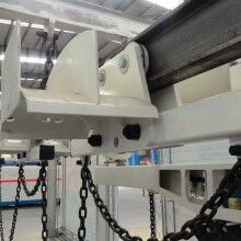 礦用液壓電纜拖掛單軌吊是用于煤礦綜采工作面順槽電纜、乳化液高壓膠管和水管的吊掛與移動的專用運輸裝置。在綜采工作面運輸巷道一側(cè)的頂板下,利用錨桿和鏈條吊掛懸空軌道,拖運車將所有電纜和高壓膠管、水管都吊掛在上面,利用工作面乳化液泵站作動力,通過油缸和連桿組成的液壓步進式推拉裝置,實現(xiàn)電纜、高壓膠管和水管沿著巷道吊掛和移動。該裝置避免了井下電纜凌亂擺放,減少了電纜的占用空間與電纜的移動次數(shù),避免了人工拖動電纜,極大地減少了工人0*680的勞動強度和作業(yè)效率。