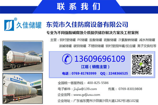 公司主要產(chǎn)品包括:久塑牌(1-125m3)立/臥式鋼襯塑(PE/PO)/碳鋼/不銹鋼儲罐、(5-50m3)管口一體成型PE儲罐、鋼襯塑攪拌罐/反應(yīng)罐/過濾罐/中和罐、離子交換柱及其它化工而腐蝕非標準設(shè)備。