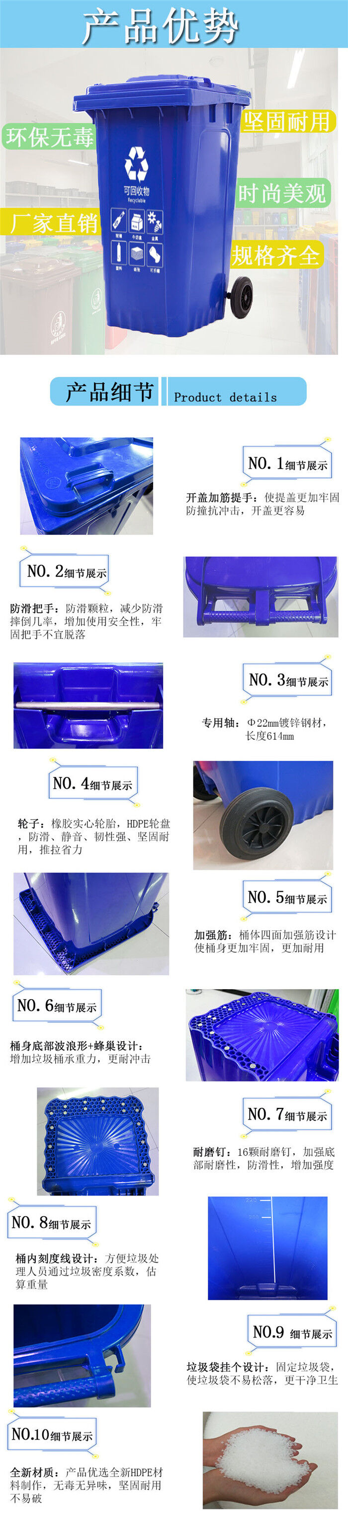 5.適用范圍:塑料垃圾桶適用于大街、社區(qū)、醫(yī)院、餐廚、醫(yī)療、小區(qū)、學校、市政等行業(yè)