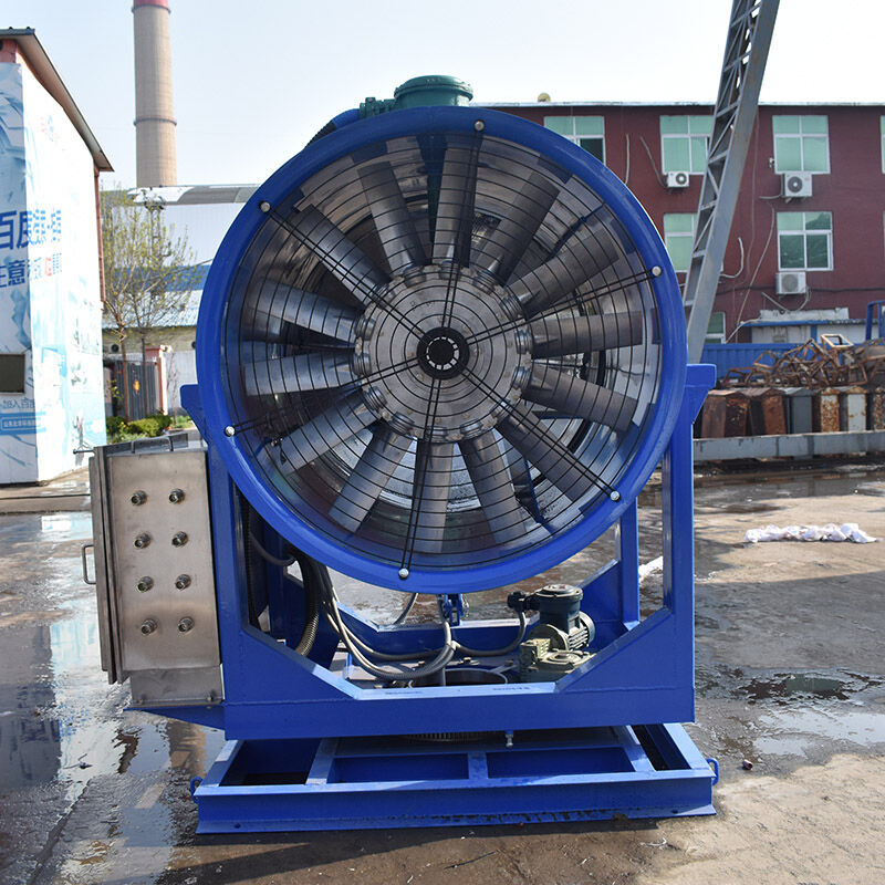 合理放置在鋼材焊接的主體框架內,最下部是輪胎。霧炮機工作時高壓泵將水加壓通過風筒前部的噴霧噴頭霧化,風機風筒出風將水霧擴散到需要揚塵控制的區(qū)域,使水霧與粉塵顆粒充分接觸、碰撞、結合變成大顆粒團聚從而自然沉降,