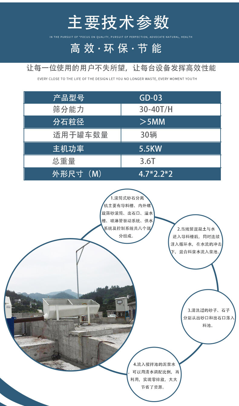 滾筒式砂石分離機主要有導(dǎo)料流槽、內(nèi)外螺旋篩砂滾筒、出石口、溢水槽、噴淋管、驅(qū)動系統(tǒng)、供水系統(tǒng)及控制系統(tǒng)共八個部分組成。當(dāng)殘留混凝土與水進入導(dǎo)料槽后,同時連續(xù)注入循環(huán)水,在水流的沖擊下,混合料漿水流入漿池。清洗過的砂子、石子分別從出砂口和出石口落入料池。流入攪拌池