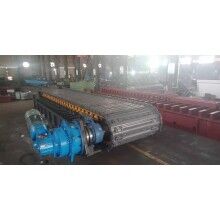 重型板式給料機(jī)是由電動(dòng)機(jī)轉(zhuǎn)動(dòng),再經(jīng)過聯(lián)軸器、減速器等帶動(dòng)主軸旋轉(zhuǎn),并通過主軸裝置上的鏈輪與鏈條嚙合帶動(dòng)鏈條上的鏈板運(yùn)動(dòng),達(dá)到運(yùn)送物料的目的,鏈板間隙可除去原料中的細(xì)粒泥土。在驅(qū)動(dòng)裝置的減速器上常裝有逆止器(安裝傾角大于15°時(shí)),以防止停機(jī)時(shí)發(fā)生倒轉(zhuǎn),并可通過變頻裝置調(diào)節(jié)給料速度。重型板式給料機(jī)是礦石輸送系統(tǒng)的重要設(shè)備,常用在原料倉底,可連續(xù)、均勻的向初級(jí)破碎機(jī)給料,能在露天、潮濕等惡劣環(huán)境下可靠地工作,該機(jī)已在大型選礦廠破碎車間及水泥企業(yè)等廣泛使用。