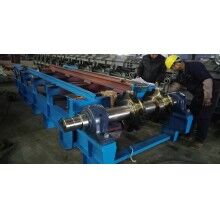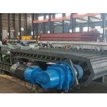 通過分析研究上述問題,結(jié)合國內(nèi)外給料機使用情況,重新設(shè)計制作了一臺新型給料機,主要特點是:采用板式給料機連續(xù)給料;板式給料機料板采用雙圓弧、節(jié)點重合的方式,解決了漏料問題;板式給料機安裝角度為18°,可使物料緩慢分散跌落到皮帶機上;撥料棍采用逆物料方向旋轉(zhuǎn),以控制物料層的厚度;料斗設(shè)計采用漸開式,解決了膨料問題;電機采用變頻控制,可控制出料速度。經(jīng)過三個多月的的現(xiàn)場使用,證明能夠完成勻料,效果較好。