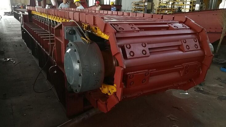 整機的工作原理為:設(shè)備安裝于料倉下,料倉底部物料直接壓在設(shè)備的鏈板組件上,料倉的前部有寬度為1.8m的開口,當動力部件帶動主軸旋轉(zhuǎn)時,鏈板組件隨之在料倉下向前移動,帶動料倉底部物料通過缺口移出料倉,物料到主軸處鏈板組件改向時下落,完成物料的輸送工作。主軸下部可設(shè)破碎機,也可直接設(shè)帶式輸送機,對物料進行下一步的長距離輸送。