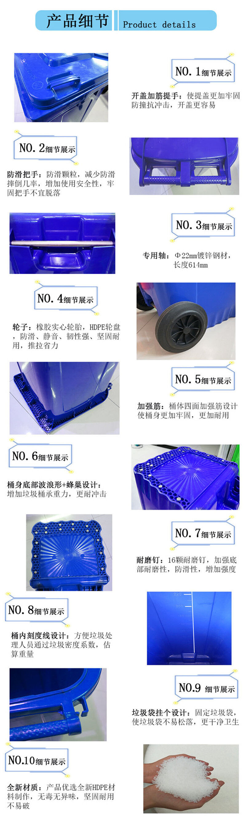 塑料分類垃圾桶經(jīng)久耐用,輕巧靈活,外型美觀,利于環(huán)保,置負(fù)載后輪,可跨越梯級或路邊臺階,內(nèi)外表面光潔,便于倒空垃圾與清洗,用于各類公共場所收集廢棄物或原料搬運(yùn),大大提高工作效率,計(jì)符合人體工程學(xué)。2 特點(diǎn)用優(yōu)質(zhì) 工程材料制造輕便耐用,移動靈活。種色彩,適用于不同的環(huán)境與垃圾分類收集。