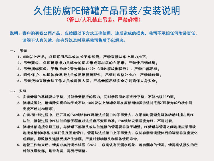 2)公司多年研發(fā),結(jié)合國(guó)內(nèi)外先進(jìn)的滾塑產(chǎn)品生產(chǎn)配方,研發(fā)出專屬久佳防腐環(huán)保型pe儲(chǔ)罐生產(chǎn)配方,能夠大大提升產(chǎn)品的質(zhì)量與性能,所用輔料也是綠色衛(wèi)生安全無(wú)污染的輔料,質(zhì)量有保障;