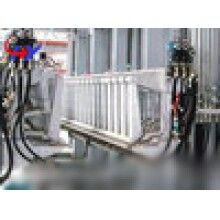 靜停養(yǎng)護達到切割強度后,??蛴煞D(zhuǎn)行車吊運至切割機工位上,翻轉(zhuǎn)吊具將模框翻轉(zhuǎn)90°放在切割小車支座上,然后由翻轉(zhuǎn)吊具機械手自動開啟模框、脫模,把坯體連同側(cè)板側(cè)立在第一輛切割小車上,脫下的??蚯謇砗笈c蒸養(yǎng)返回的經(jīng)清理噴油后的側(cè)板組合成模具,等待澆注。在組模的同時,脫模后的坯體在切割機上分部做定點切割,首先第一輛切割小車帶動坯體行走經(jīng)過縱切裝置進行縱向切割,坯體在進行縱向切割時,分別由切割刀片和由汽缸張緊的切割鋼絲同時完成側(cè)面、面包頭及頂面廢料的切割與清理,縱切結(jié)束后,切割小車繼續(xù)行走至橫切裝置中央位置停止,橫切架自上而下垂直降落進行坯體的橫向切割,橫切時切割鋼絲作鋸裝擺動,完成坯體的鋸裝橫向切割。坯體切割完成后,人工推鏟出去頂部面包頭。小車置換裝置啟動,由切割機下方小車置換油缸將切割好的坯體連同側(cè)板頂起,下方第一輛小車返回起始位置,去承載新的帶切割的坯體,第二輛小車替換第一輛小車位置,并承載坯體及側(cè)板行走至預定位置,最后坯體由半成品吊車連同地板吊運至釜前蒸養(yǎng)小車上,在軌道上進行編組。